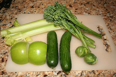 Ingredients for this morning's breakfast are celery, broccoli, brussel sprouts, cucumbers and a green apple :)